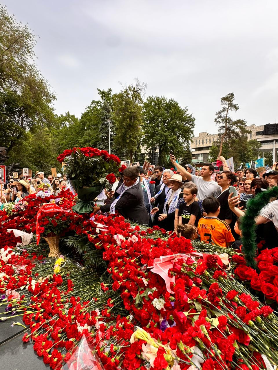 гвардияшы-панфиловшылар саябағында ескерткішке гүл шоқтарын қойып, Ұлы Отан