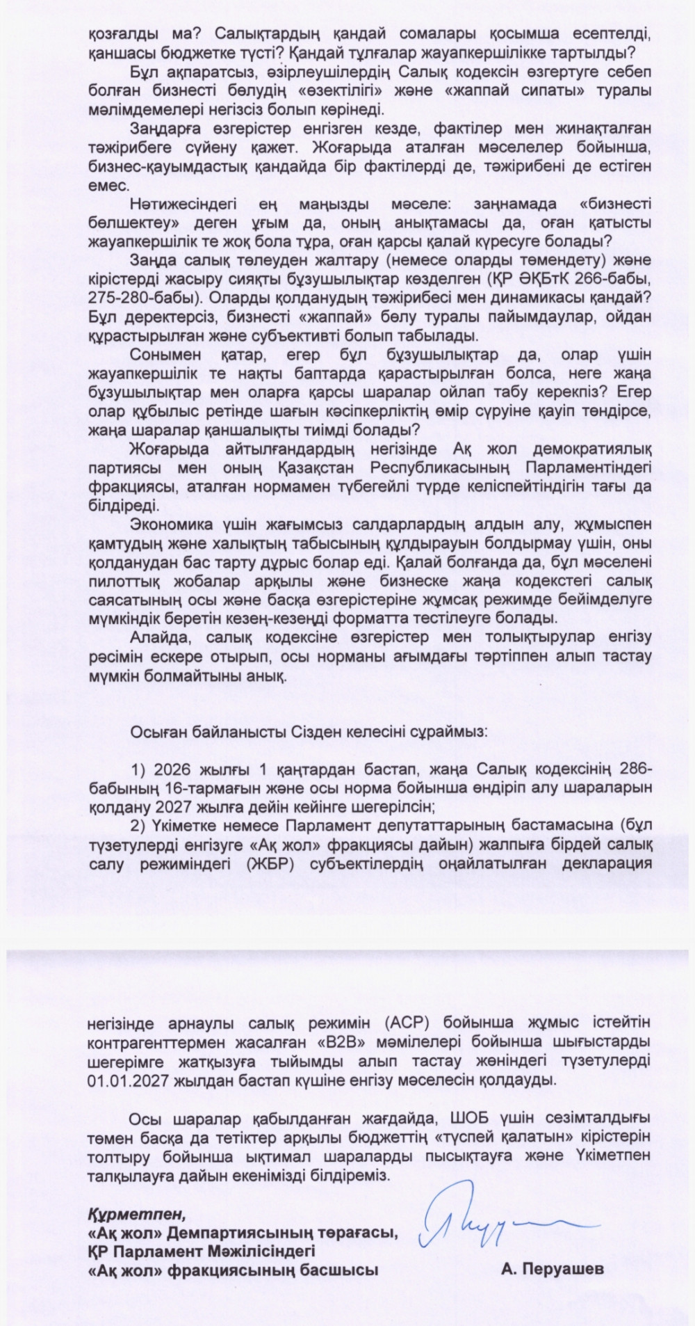 «Ақ жол» демократиялық партиясы Үкіметке жаңа Салық кодексіндегі заңды тұлғалар мен АСР-да жұмыс істейтін («В2В») ШОБ арасындағы мәмілелерден шегерім жасауға тыйым салатын норманы жою қажеттілігі туралы ұсыныс жолдады.
