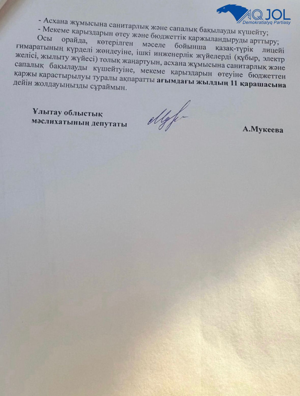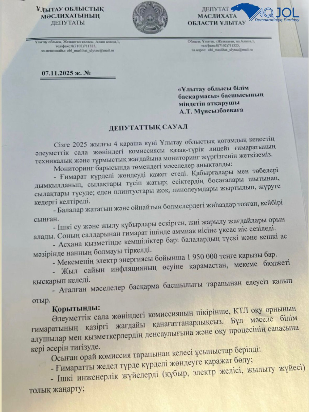 міндетін атқарушы А.Т.Мұнсызбаеваға депутаттық сауал жолдап, бақылауға алды.