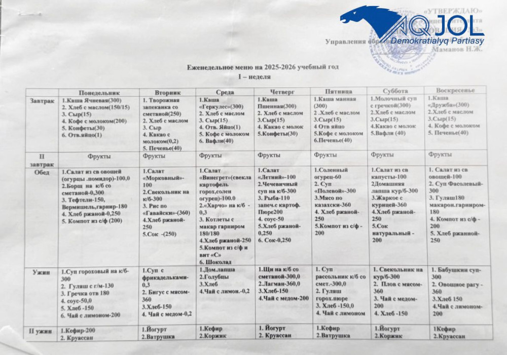 анықталды — балалардың түскі және кешкі ас мәзірінде нанның болмауы тіркелді.