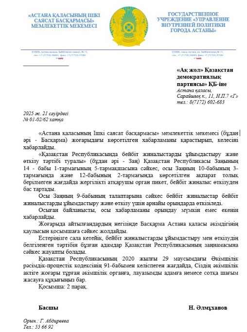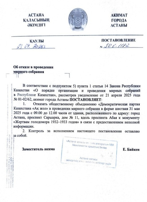 Астана қаласының әкімдігі ашаршылық құрбандарына тағзым ету үшін «Ақ жол» партиясының бейбіт шеру өткізуіне рұқсат бермеді
