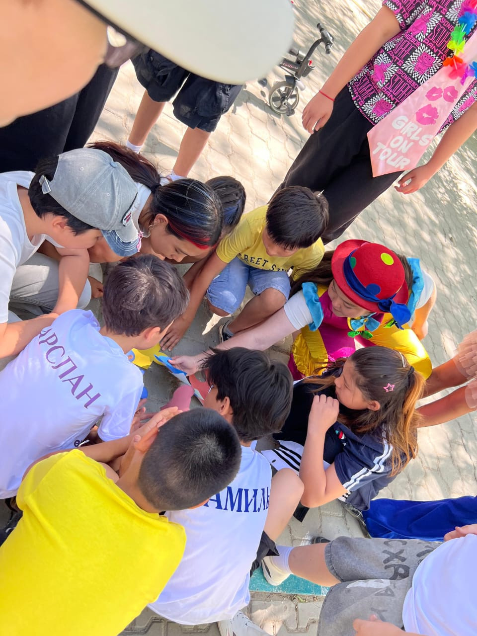 салып, би биледі және 3 топқа бөлініп эстафеталық жарыстарға қатысып, сыйлықтар