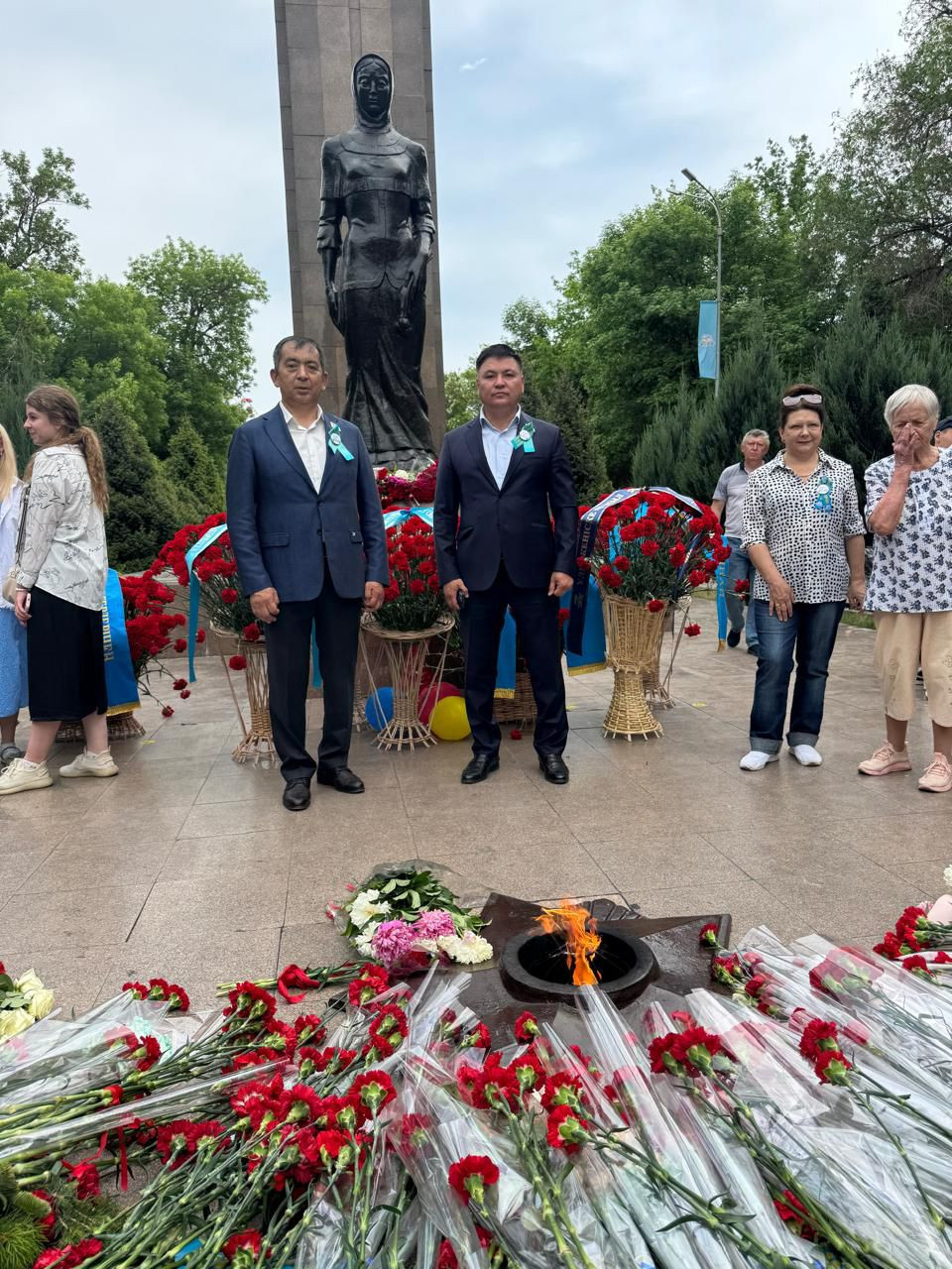алау» ескерткішіне барып, гүл шоқтарын қойып, батырлар рухына тағзым етті.