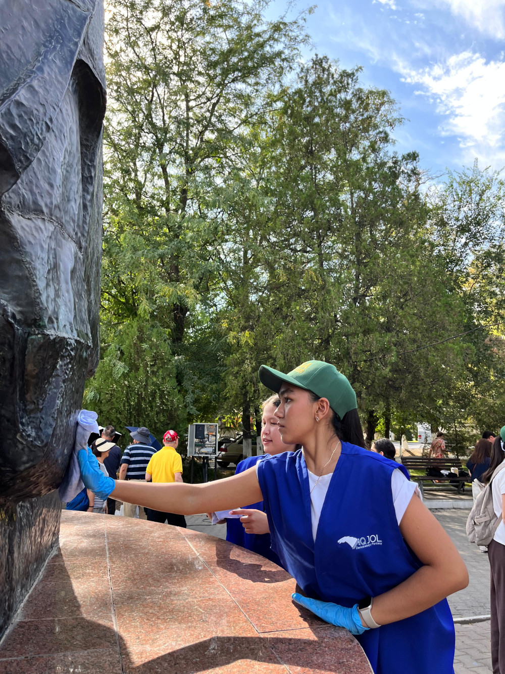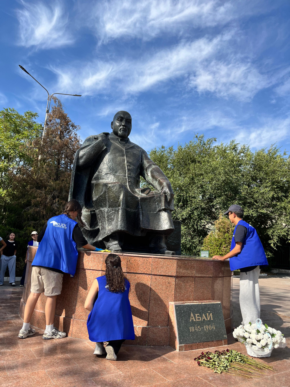 жас белсенділері Абай мүсінінің айналасын тазартып, ескерткішті жуып-сүртті.