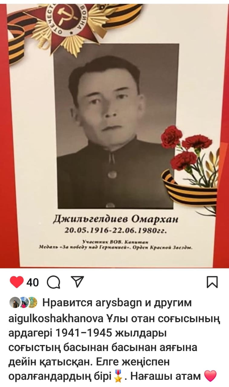 тұрғыны Ұлы Отан соғысының ардагері Жілгелдиев Омархан атамыздың қызы, 80