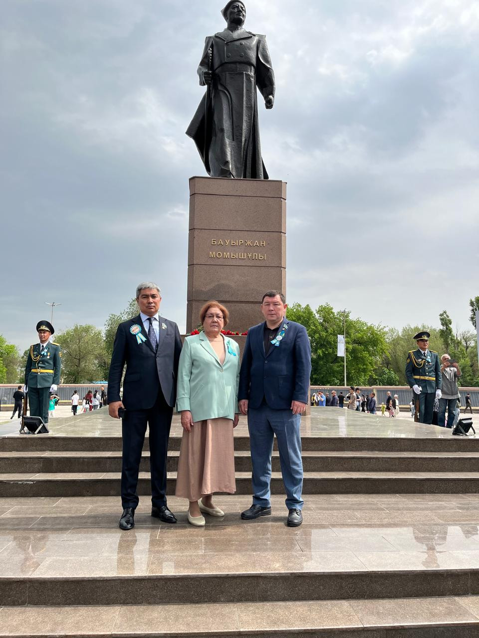 іс-шара батыр Бауыржан Момышұлының ескерткішінің алдындағы Мәңгілік алауға гүл
