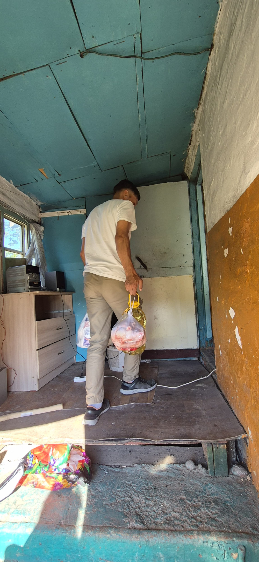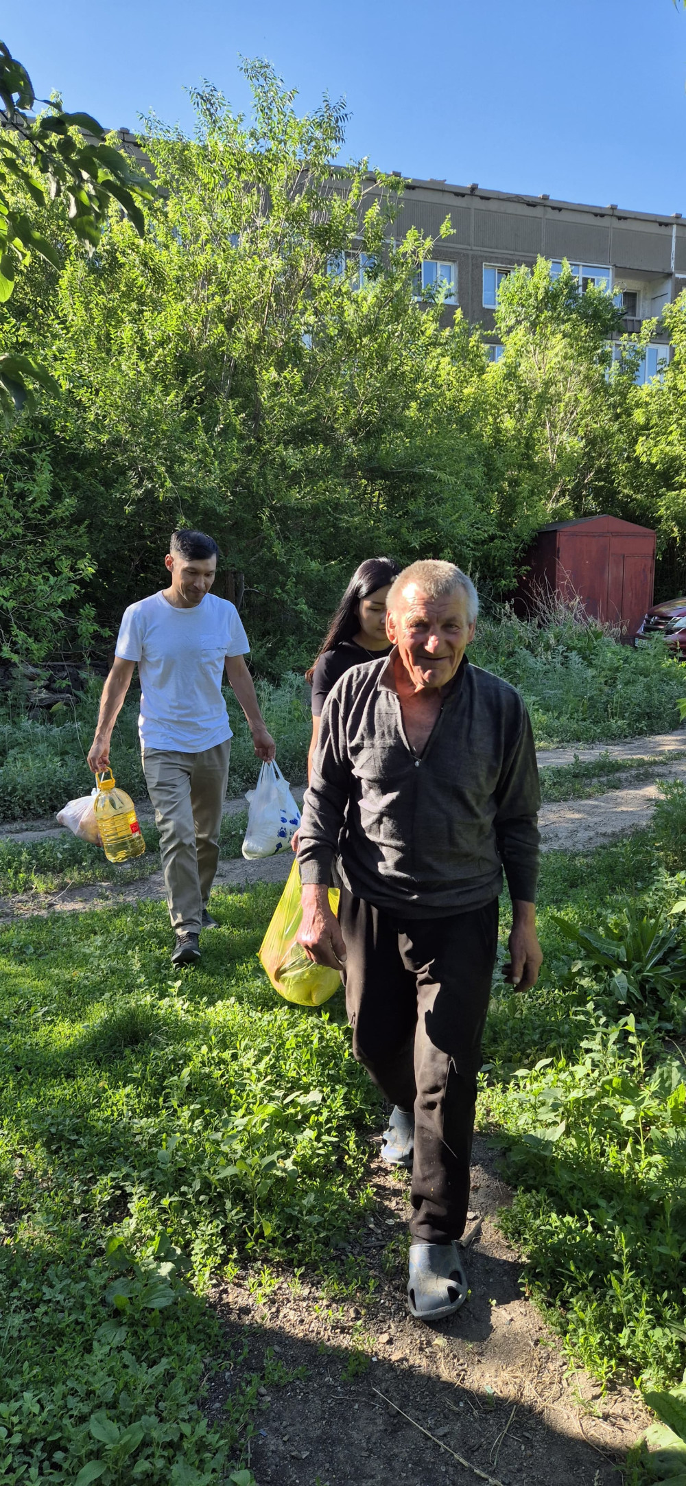 отырған зейнеткер. Оның отбасына ет, май, ұн, жарма және тәттілер жеткізілді.