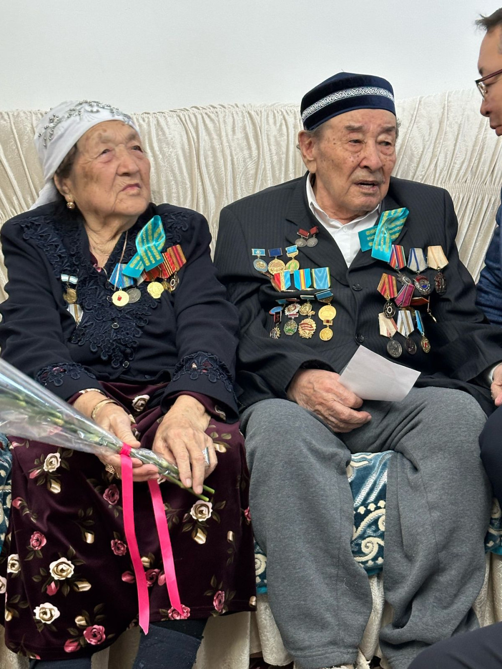 жолдарының әсерлі шақтарынан әңгімелерін тыңдап, гүл шоқтары мен ақшалай сыйлықтарын тапсырды. Ардагерлердің