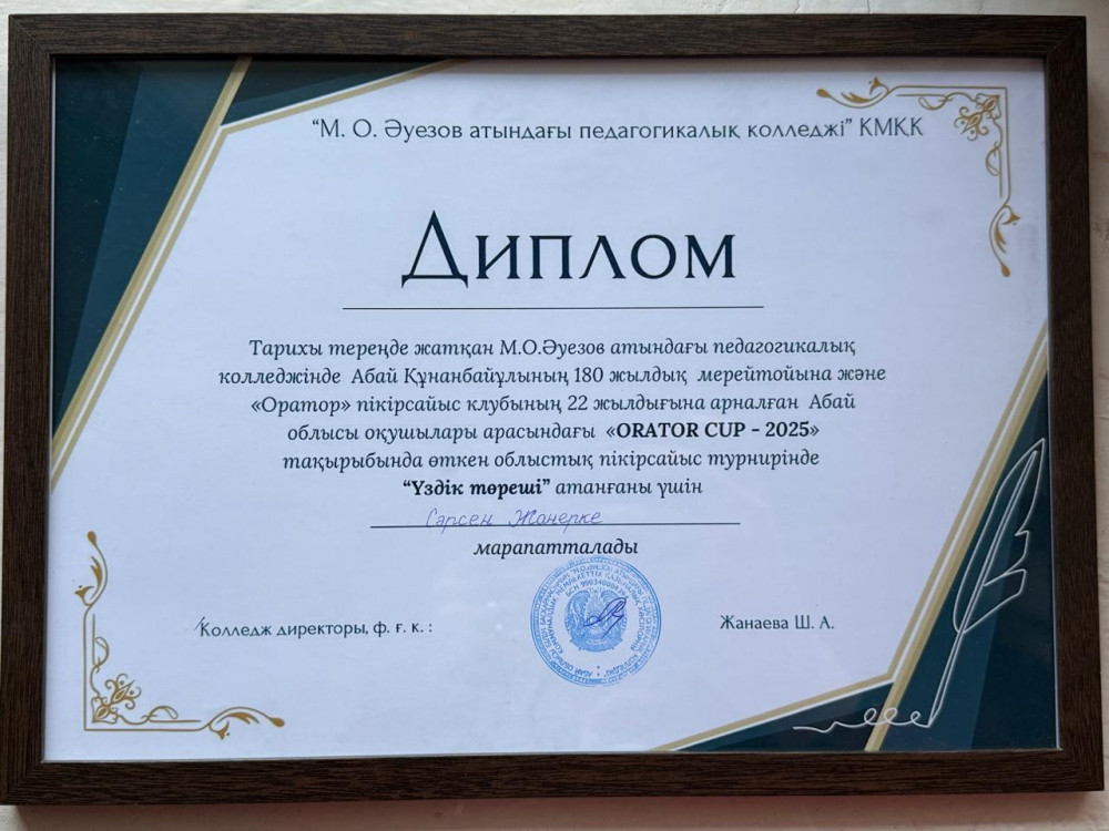 турнирінде “Үздік төреші” атанғаны үшін “Ақ жол” партиясының Абай облыстық