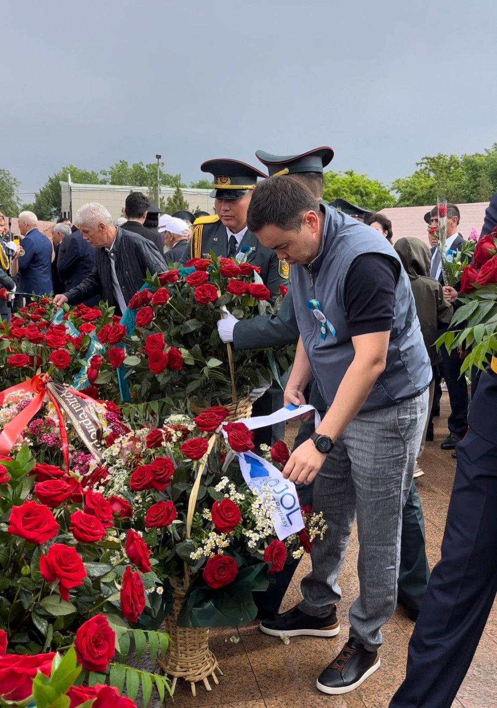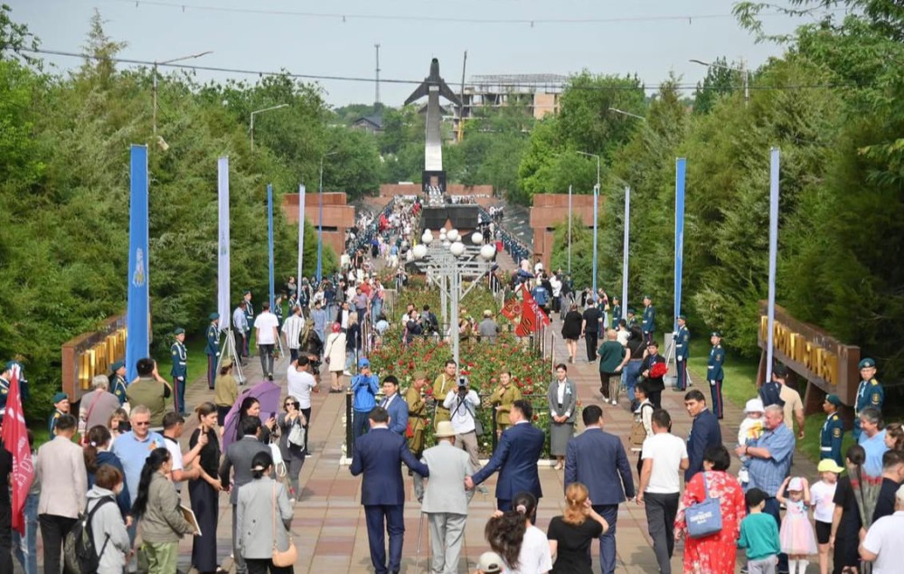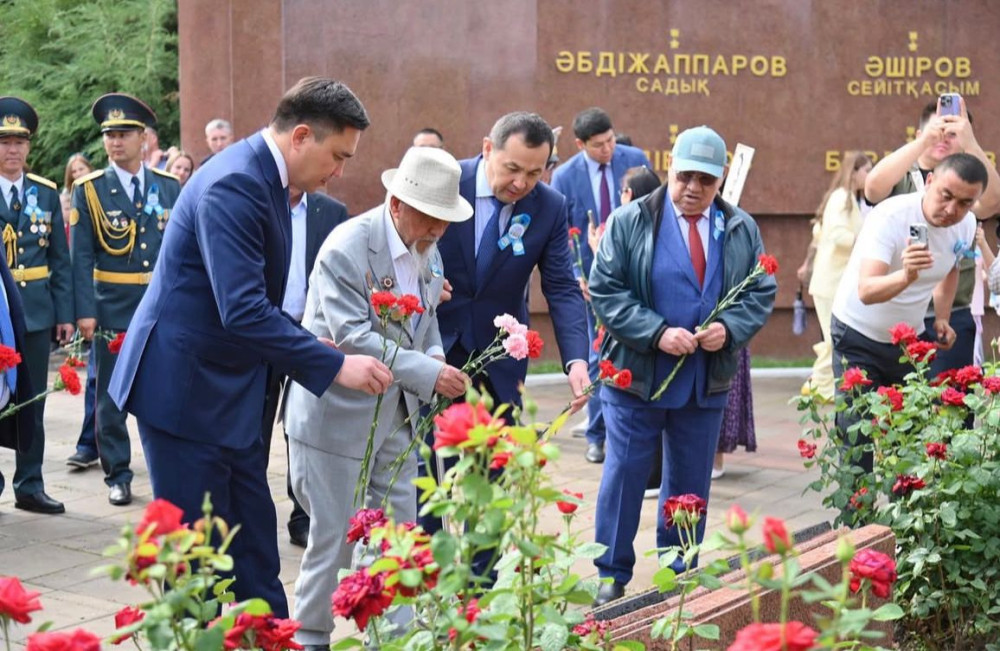 Салтанатты жиын барысында қатысушылар «Даңқ мемориалына» гүл шоқтарын қойып,