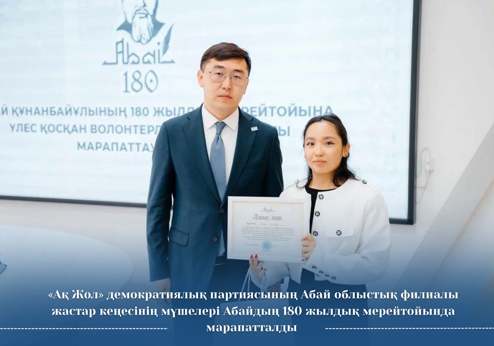 «Ақ жол» демократиялық партиясының Абай облыстық филиалы жастар кеңесінің мүшелері Абайдың 180 жылдық мерейтойында марапатталды