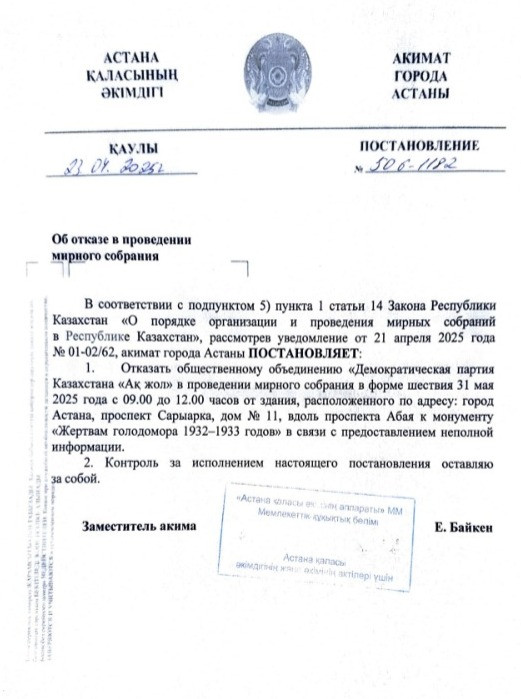 Акимат города Астаны отказал партии «Ак жол» в проведении мирного шествия в память жертв голода