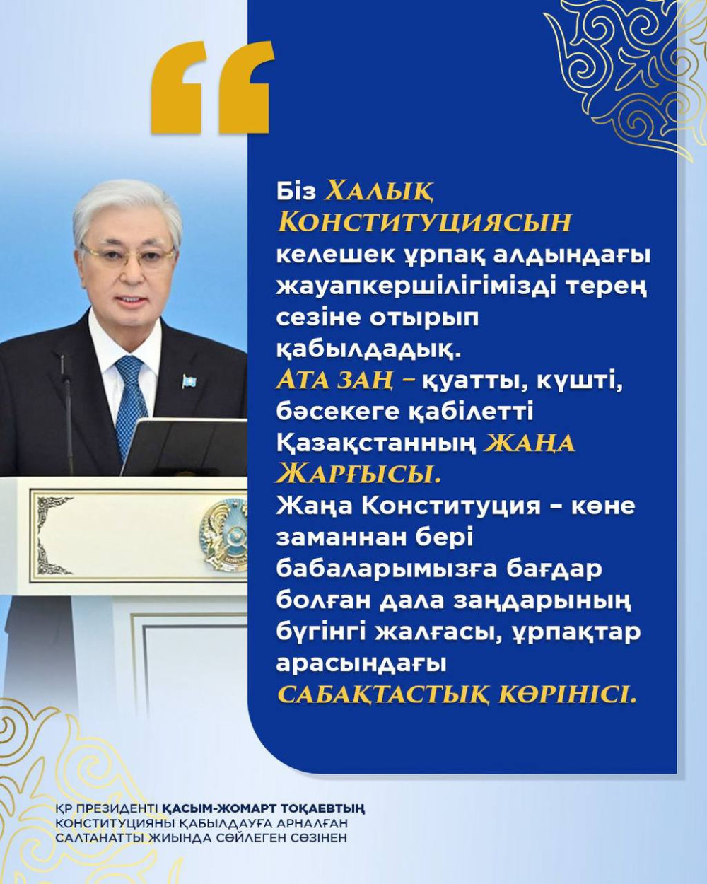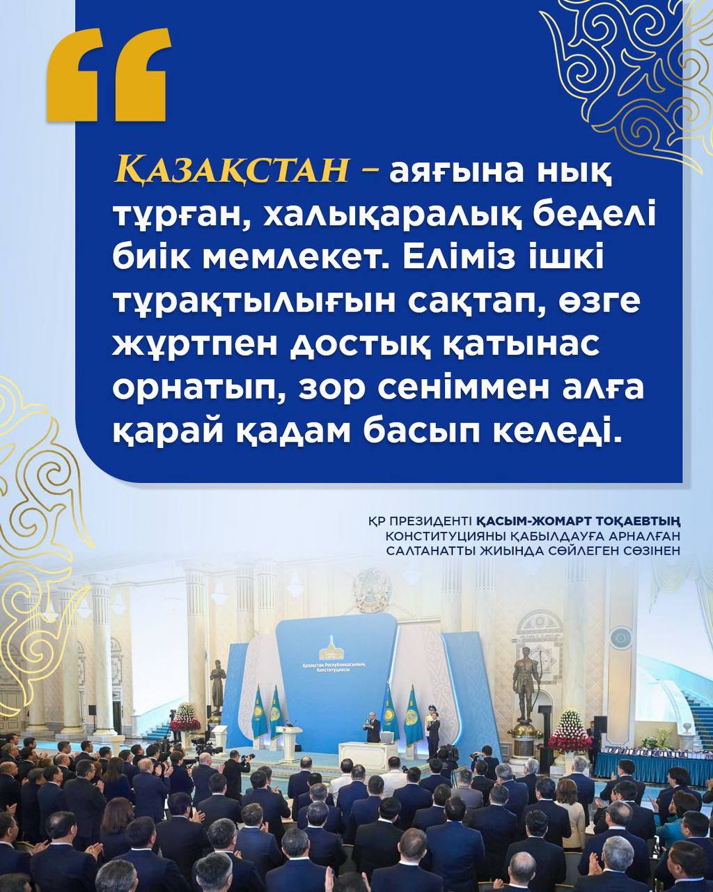 Касым-Жомарт Кемелевич отметил, что прошедший день голосования отныне становится официальным государственным праздником — Днём Конституции. Особо нужно отметить его обращение к молодому поколению о том, что новая Конституция должна стать путеводителем в будущее Казахстана и казахстанского народа – «Вам суждено превратить Казахстан в одно из самых прогрессивных и передовых государств мира» - подчеркнул он. Это очень сильное заявление, очень дерзкая амбиция, которая создаёт мощный настрой для уверенной работы в новой исторической реальности.