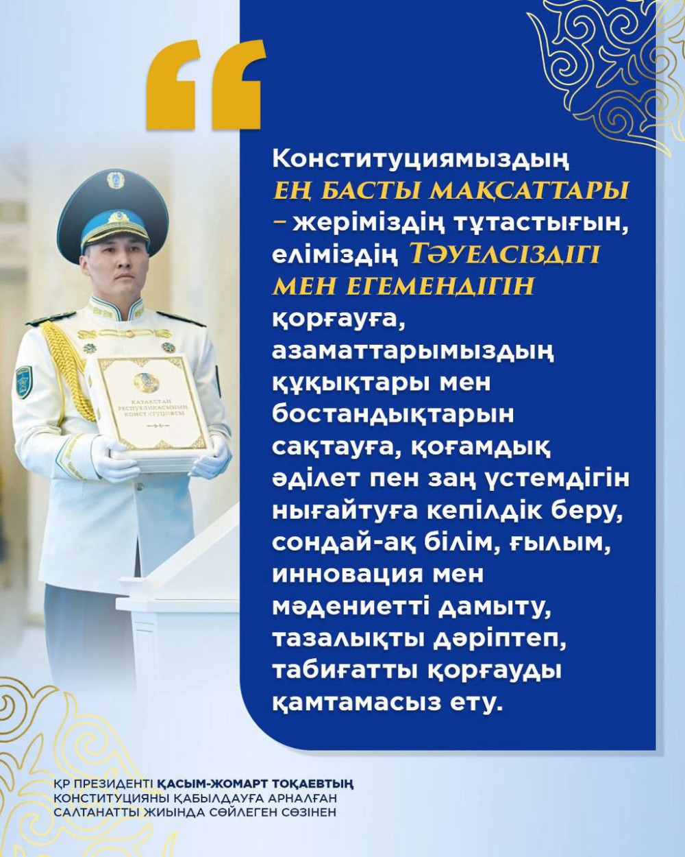 Такие акценты позволяют судить о том, какое важное значение отводит Касым-Жомарт Кемелевич обеспечению суверенитета и независимой политики Республики как в тексте Конституции, так и в своей деятельности руководителя государства.